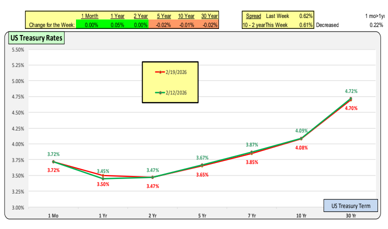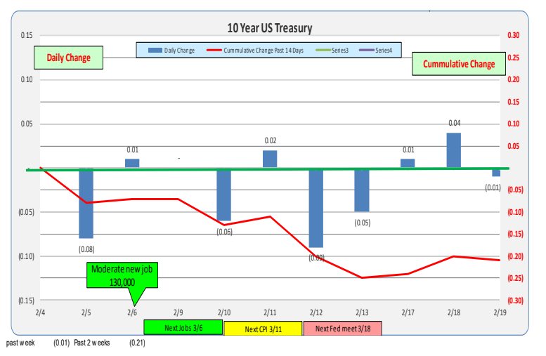 For the past week, 10 Year Treasury rates were Down 1bp. Past 2 weeks Down 21bp.