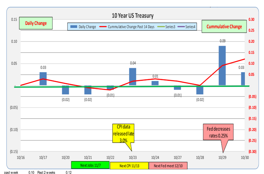 For the past week, 10 Year Treasury rates were up 10bp. Net change in 12 weeks decreased 13bp