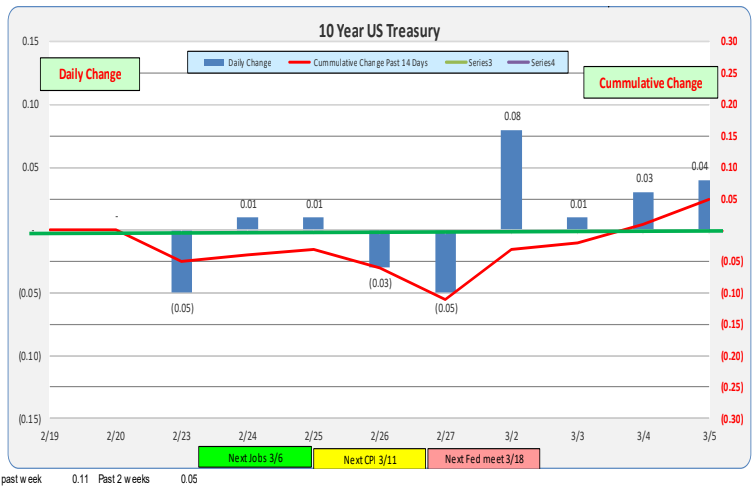 For the past week, 10 Year Treasury rates were UP 11bp. Past 2 weeks UP 5bp.