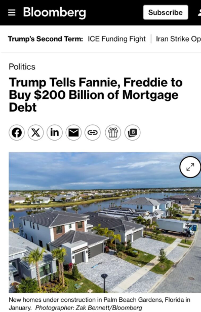 That question came up for me after reading a Bloomberg piece about President Trump directing Fannie Mae and Freddie Mac to buy $200 billion in mortgage-backed securities.