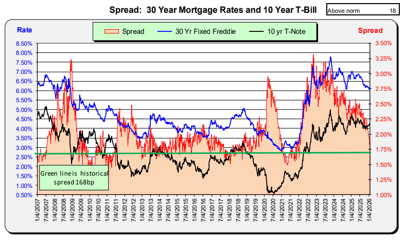 The historic spread between the 10 Year Treasury and mortgage rates is 168pb (see green line, right axis) and currently is 18bp above historical norm. In July 2024 this spread was 150bp. Mortgage rates have decreased more than the 10 year