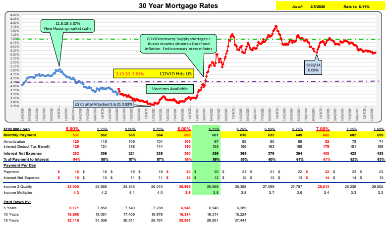 For the week ending 2.5.26 Mortgage rates increased 1bp to 6.11%. This past week, for a $100,000 loan the monthly payment increased $1 to $607/mo.