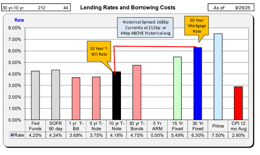 For the week ending 9.25.25 mortgage rates increased 4bps, mean while the 10 Year Treasury rates increased 7bp. Spread decreased by 3bp. With the historical spread being 168 there now exists a “safety cushion” of 44bp above the historical spread.