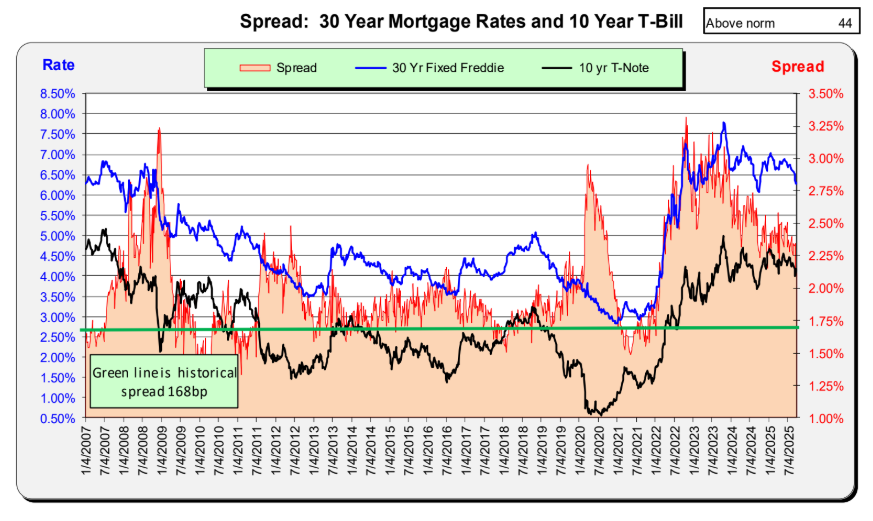 The historic spread between the 10 Year Treasury and mortgage rates is 168pb (see green line, right axis) and currently is 44bp above historical norm. In July 2024 this spread was 150bp. Mortgage rates have decreased more than the 10 year.